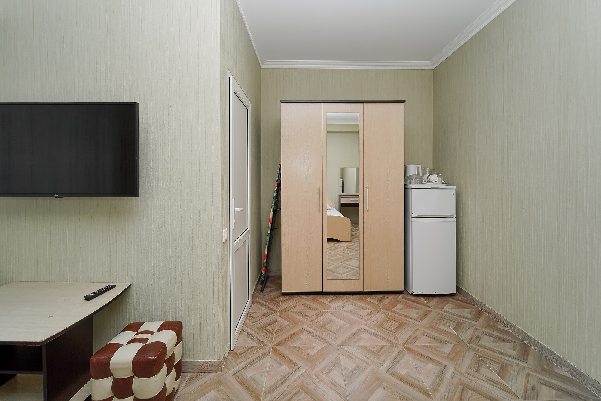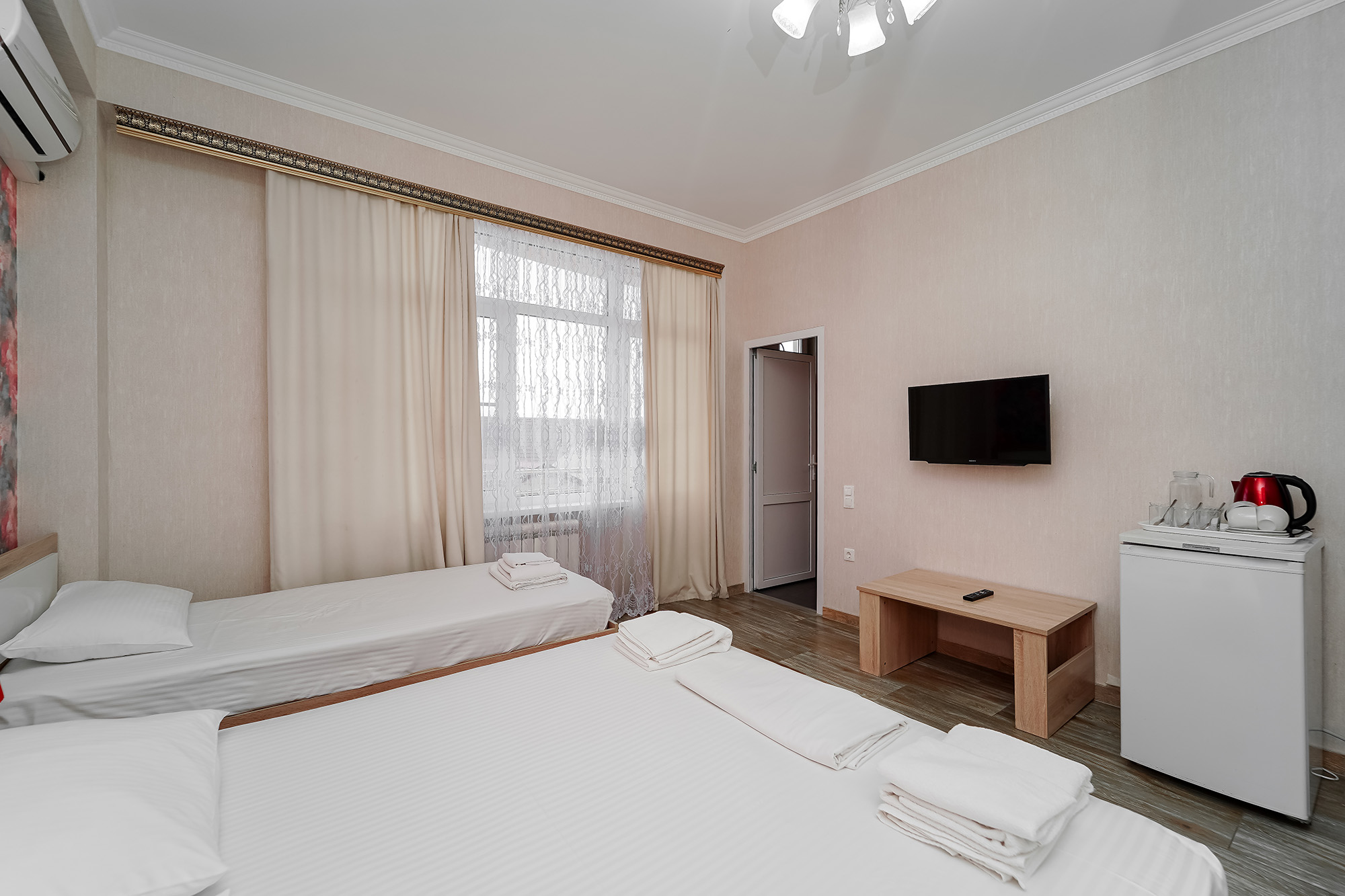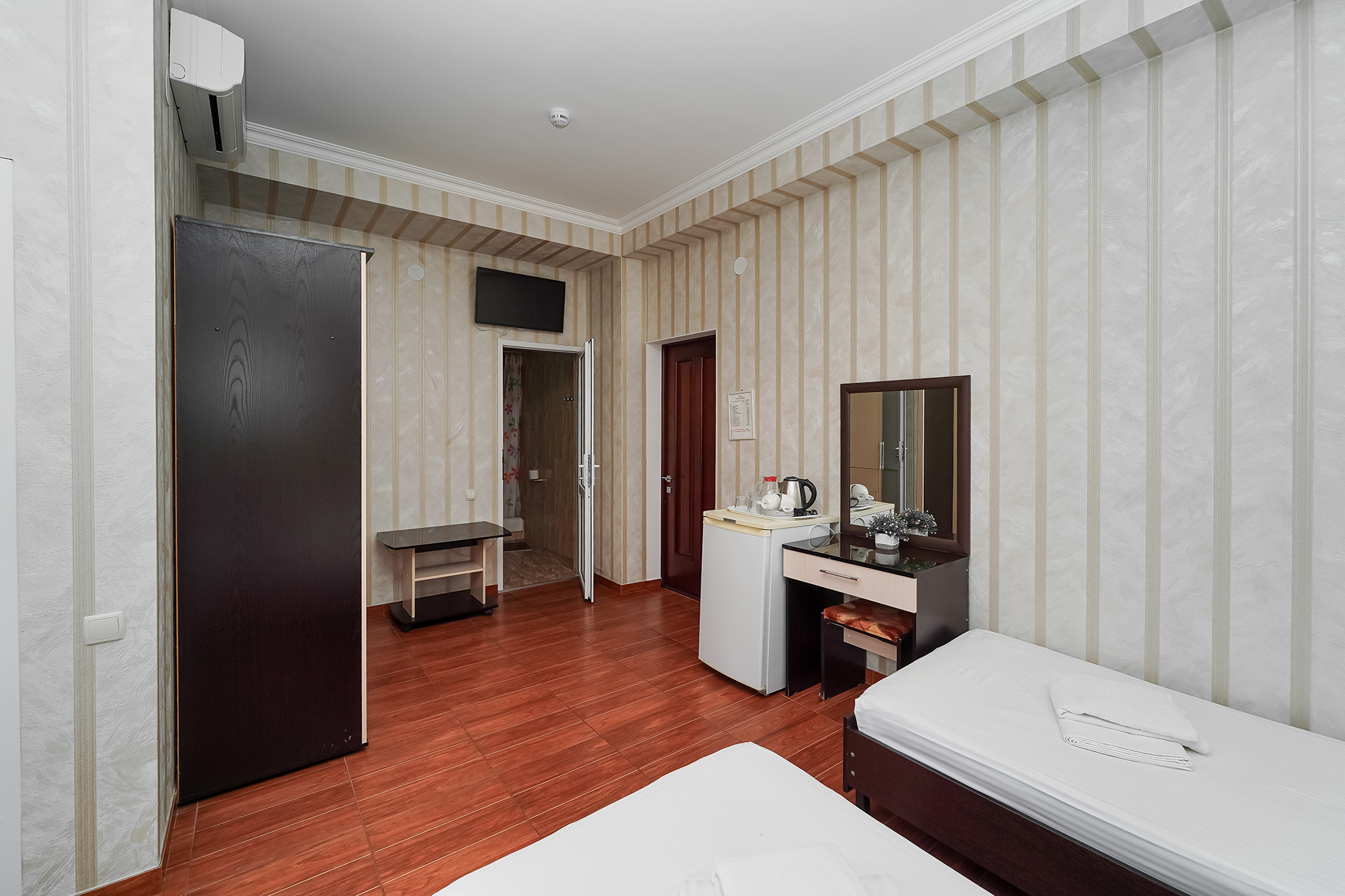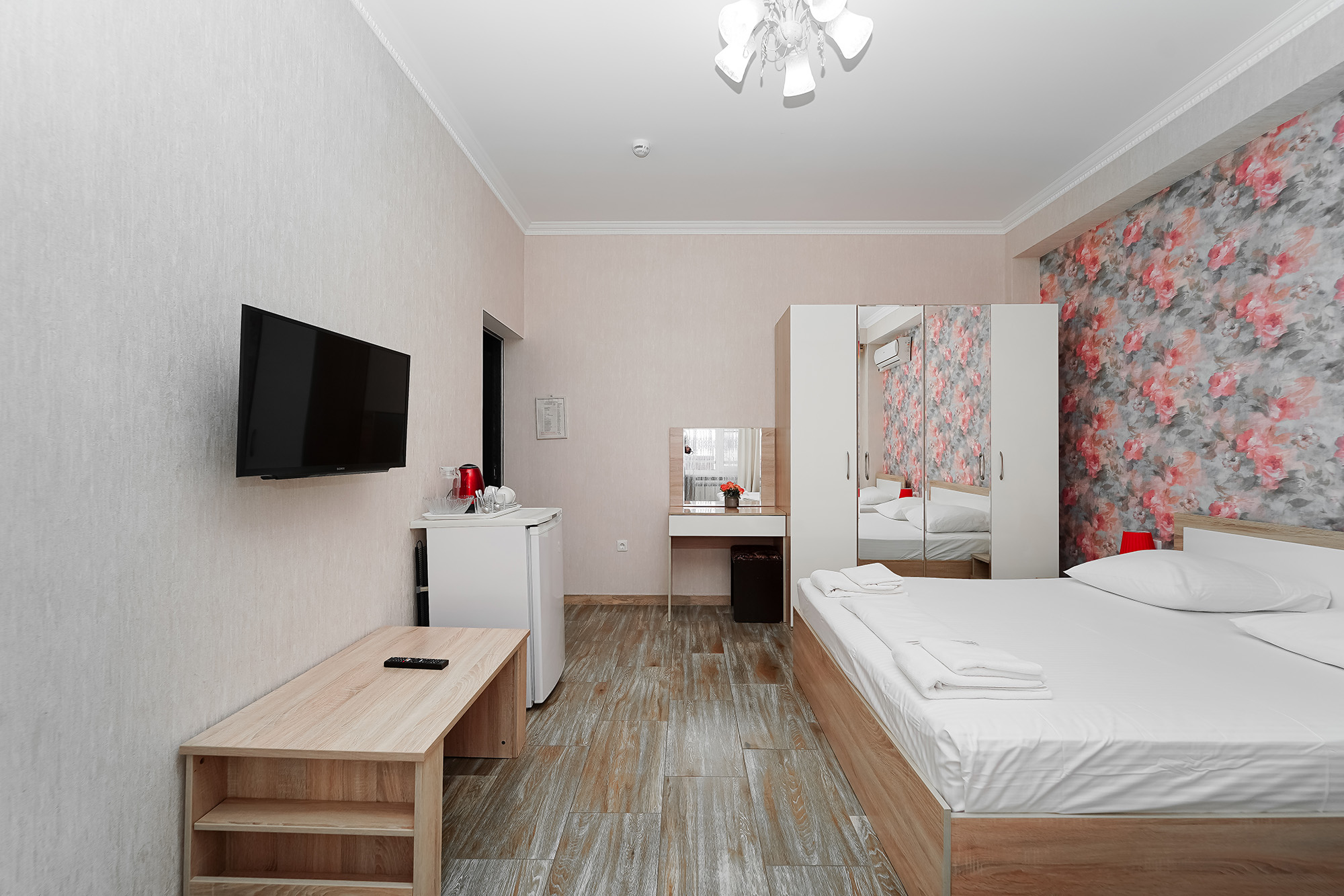 - Оборудование: кондиционер, мини-холодильник, сейф, телевизор ЖК, утюг, чайный набор посуды, электрочайник