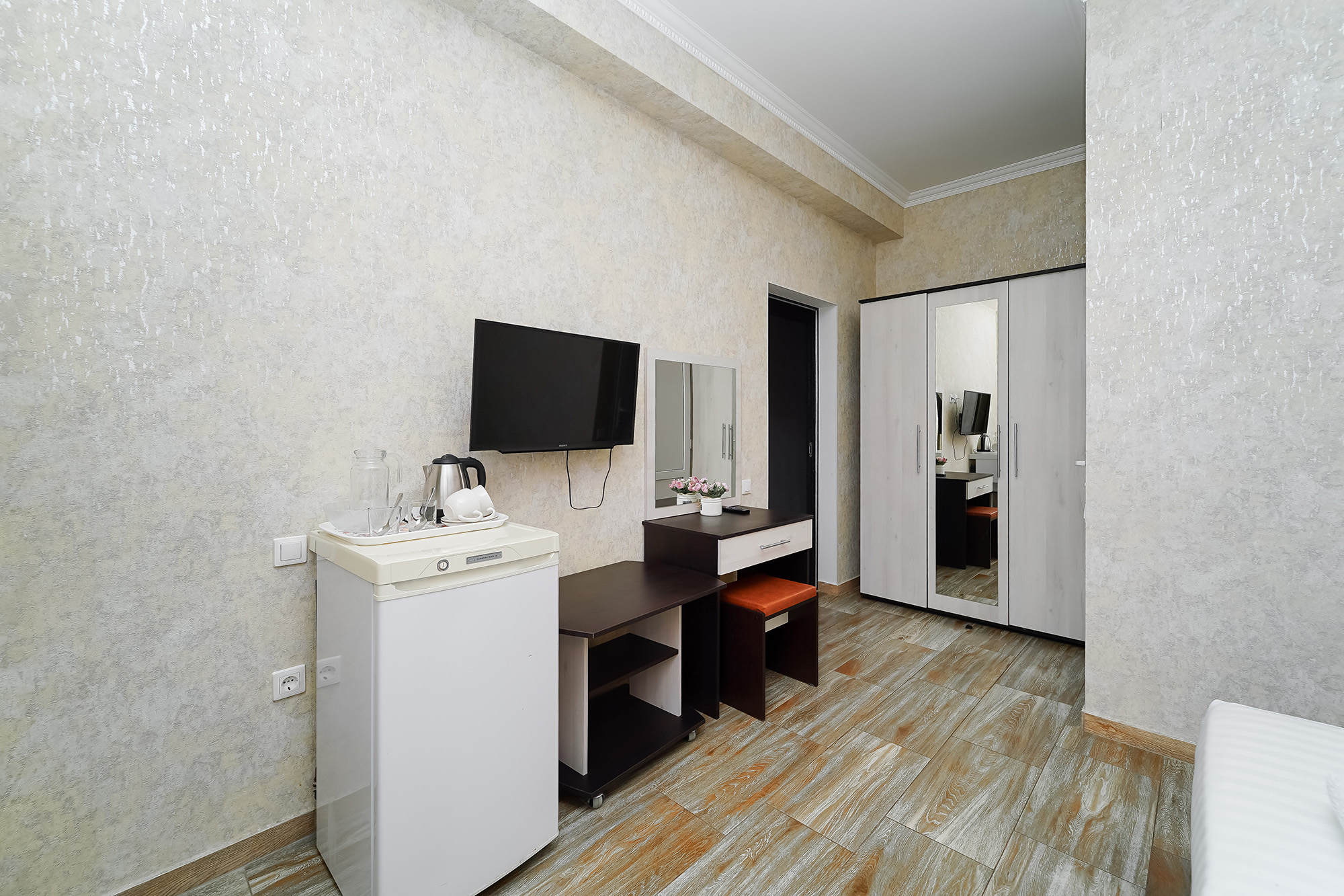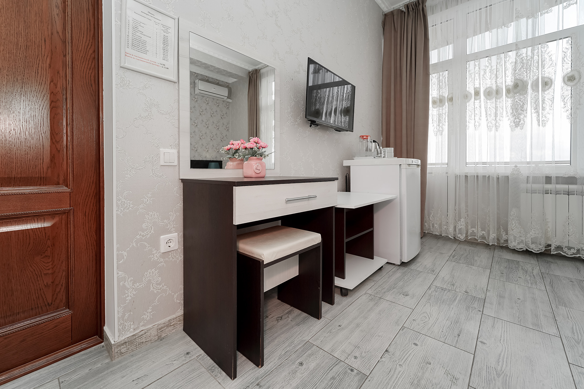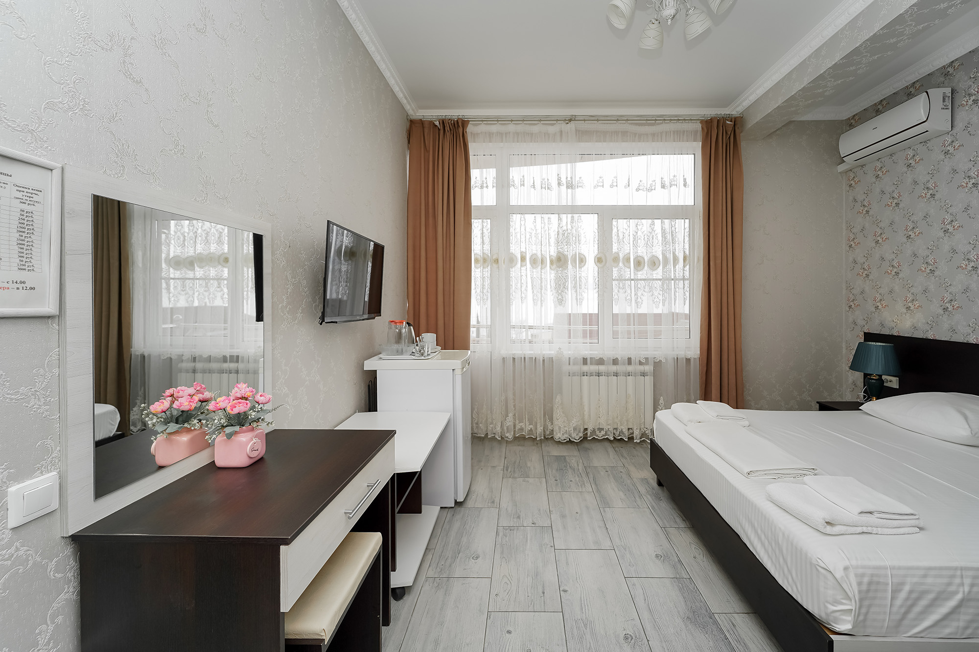 - Оборудование: кондиционер, мини-холодильник, сейф, телевизор ЖК, утюг, чайный набор посуды, электрочайник