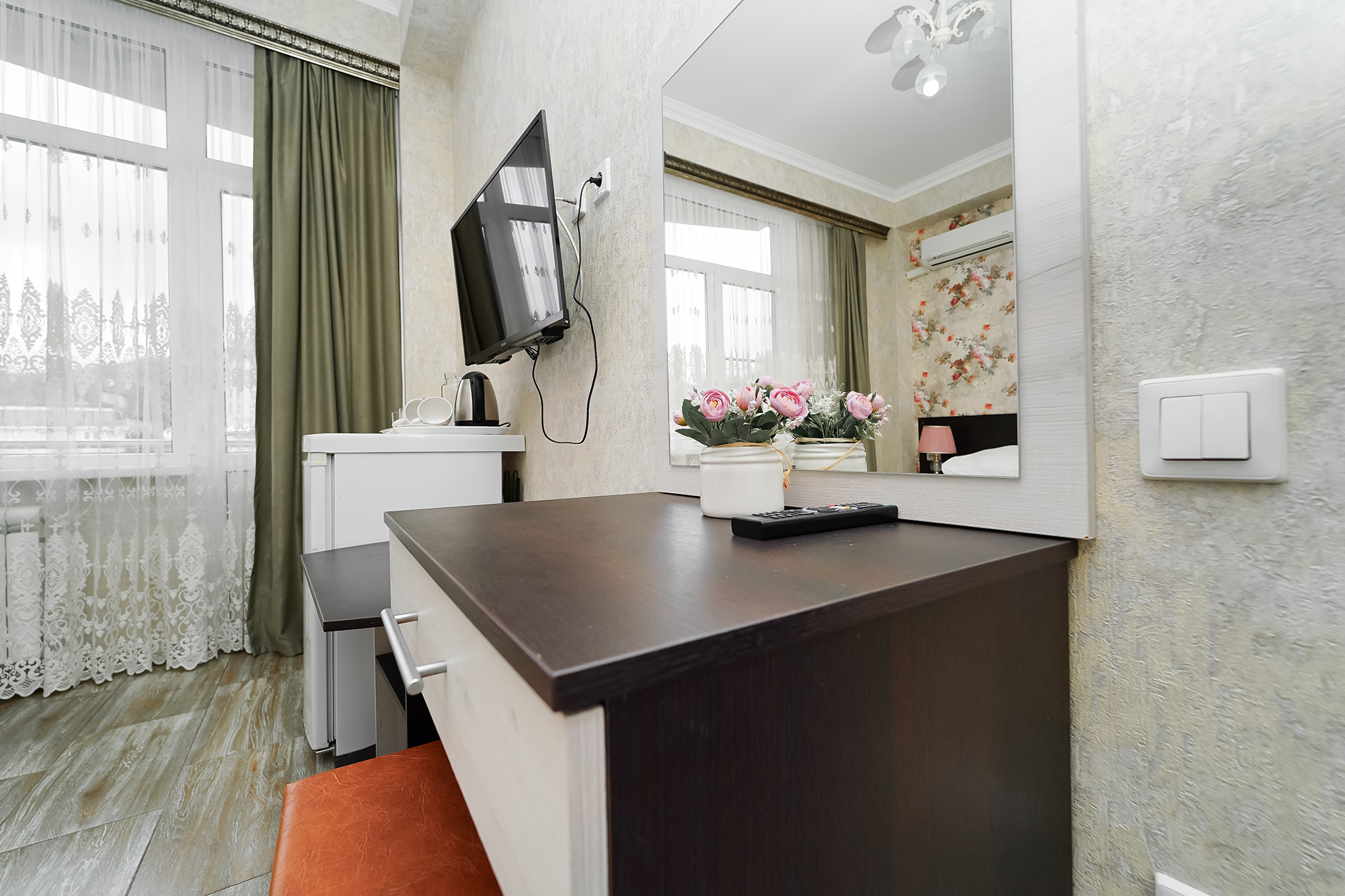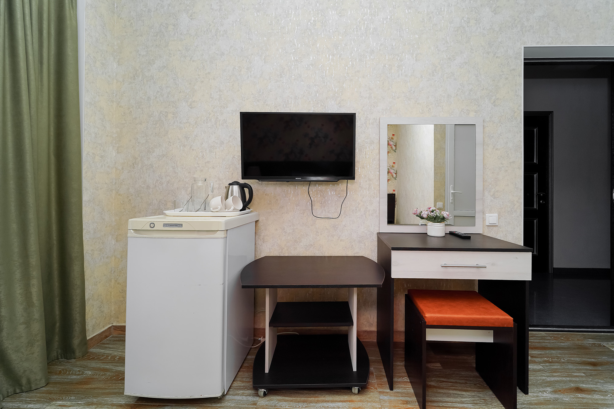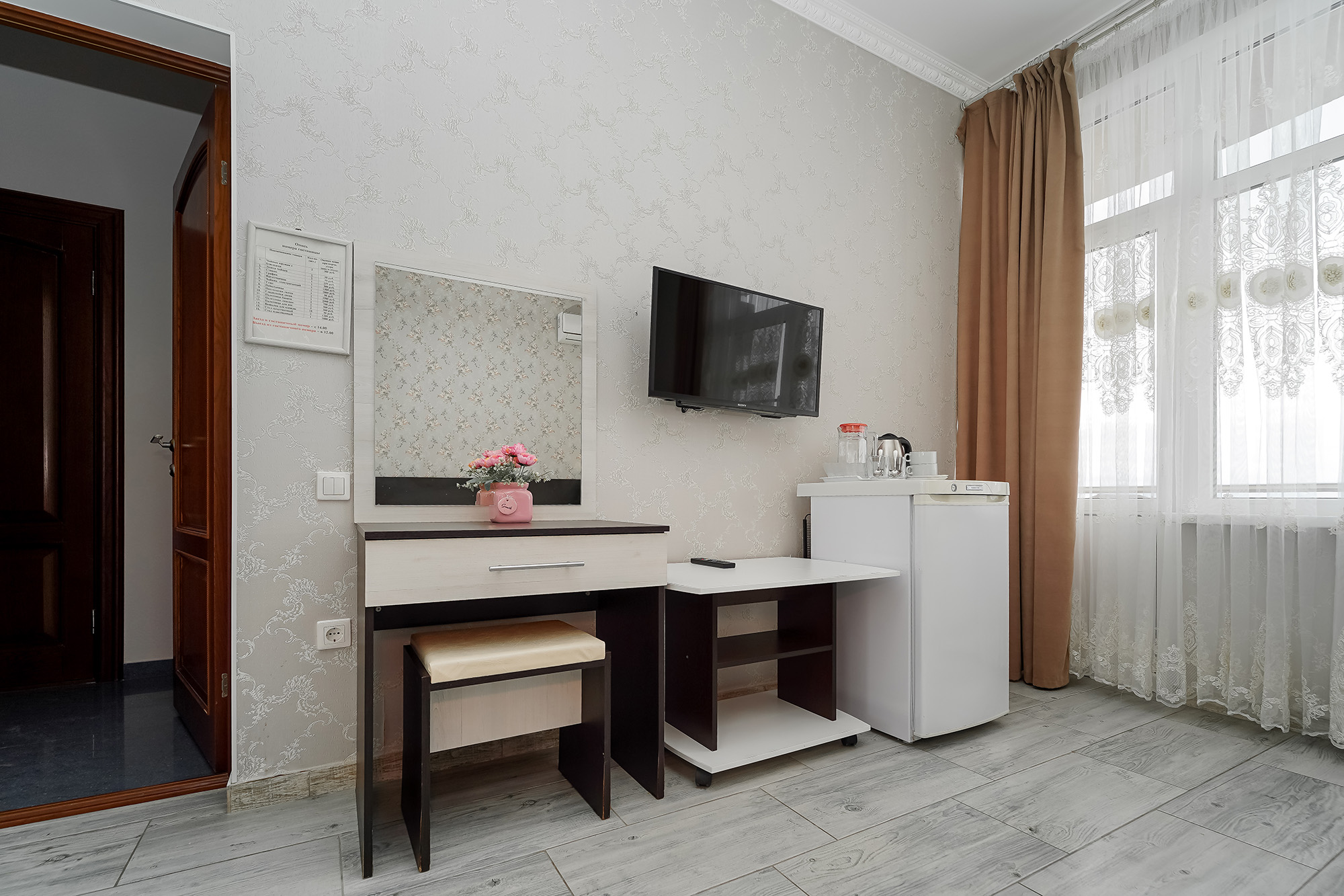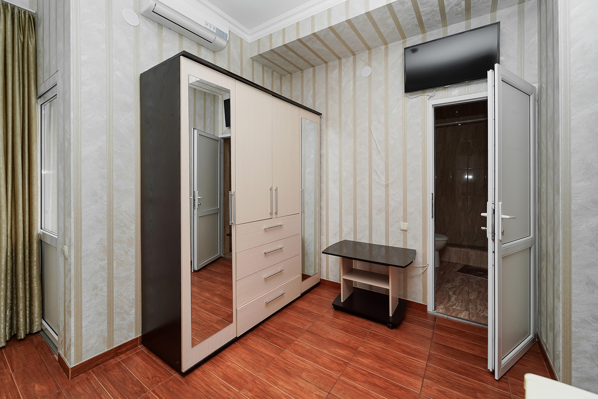 - Оборудование: кондиционер, мини-холодильник, сейф, телевизор ЖК, утюг, чайный набор посуды, электрочайник