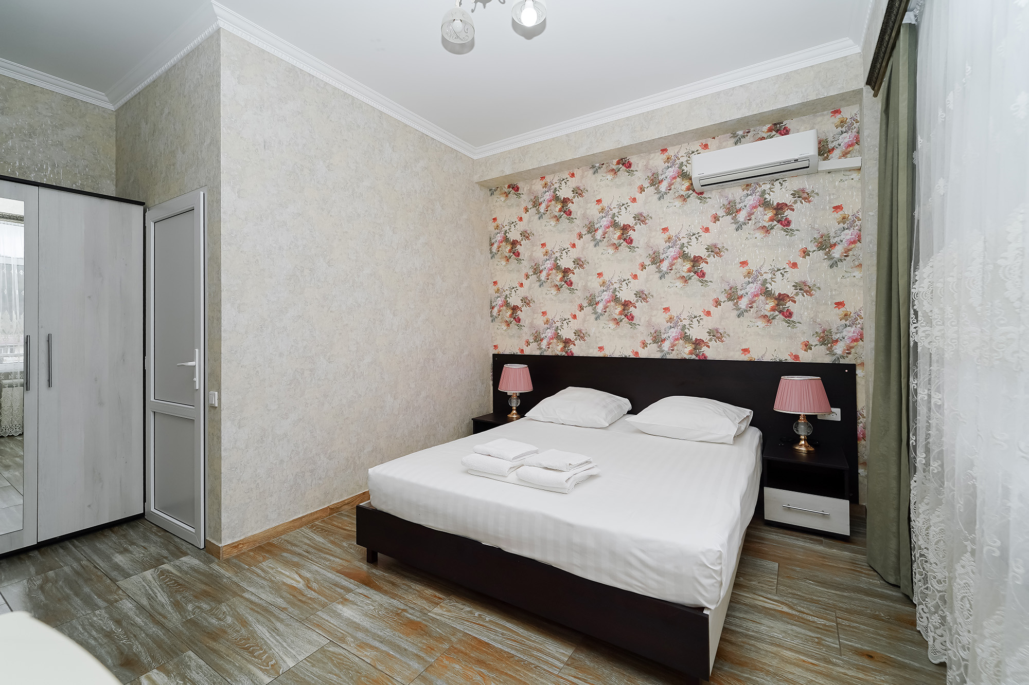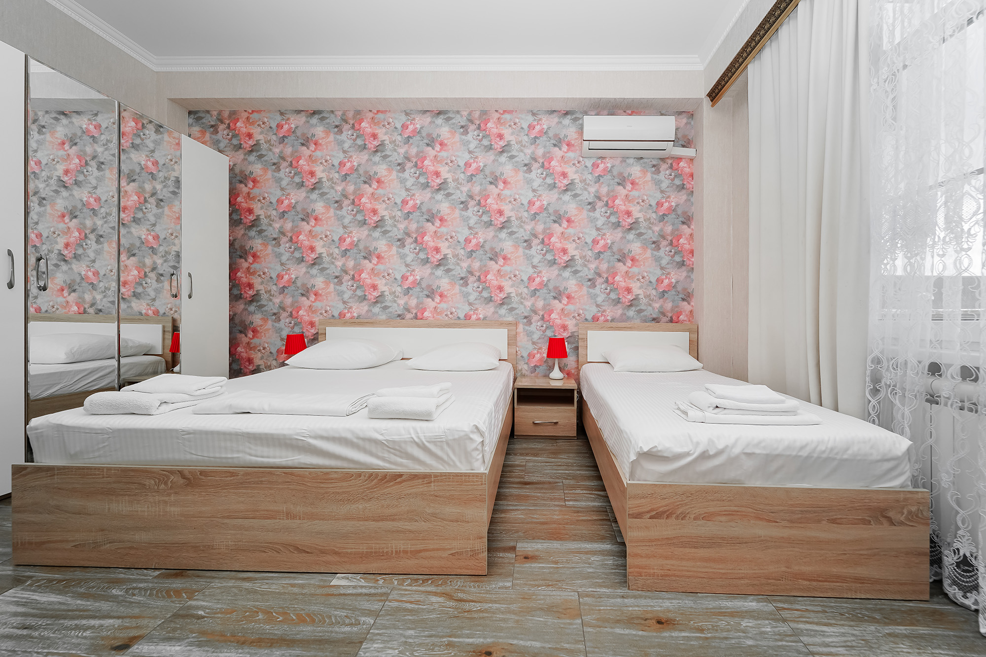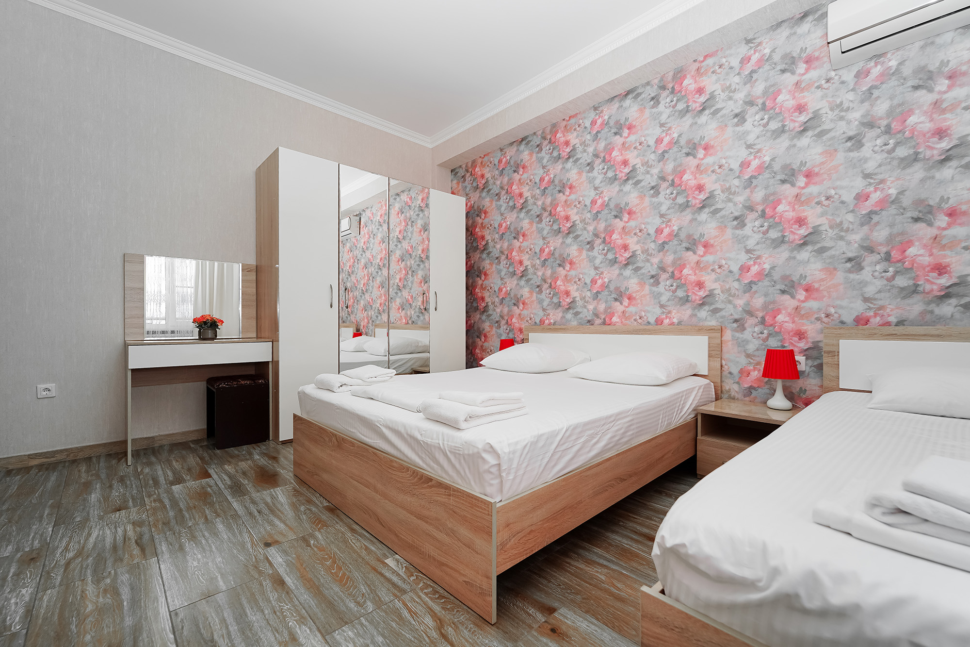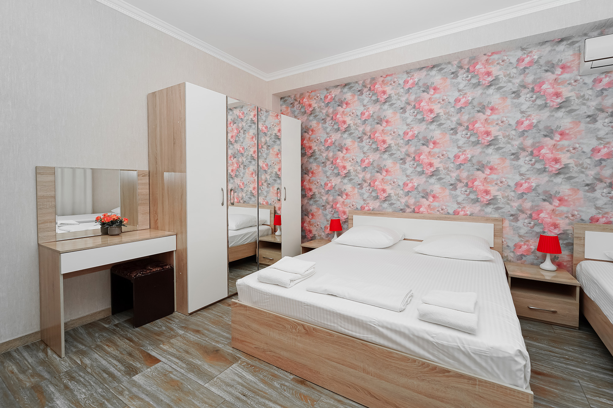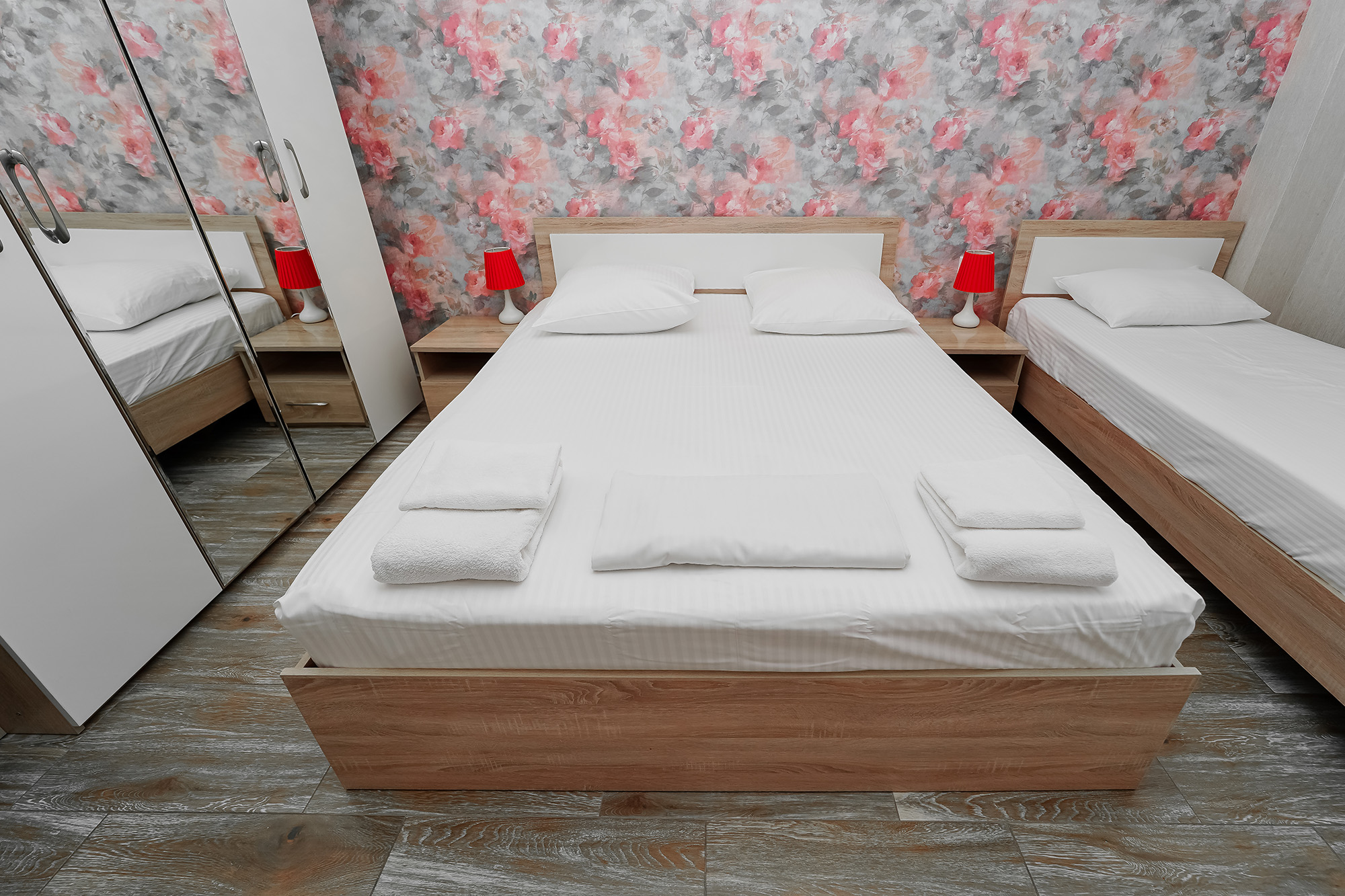 - Мебель: вешалка, зеркало, кровати односпальные, кровать двуспальная, прикроватные тумбочки, стол, стулья, шкаф