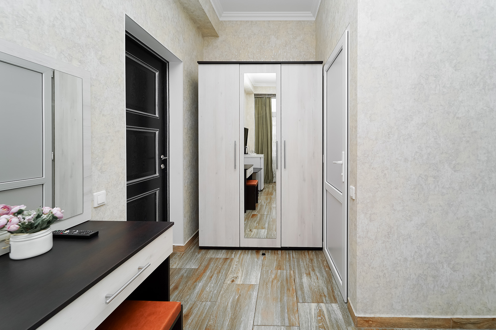 - Мебель: вешалка, зеркало, кровать двуспальная, прикроватные тумбочки, шкаф
