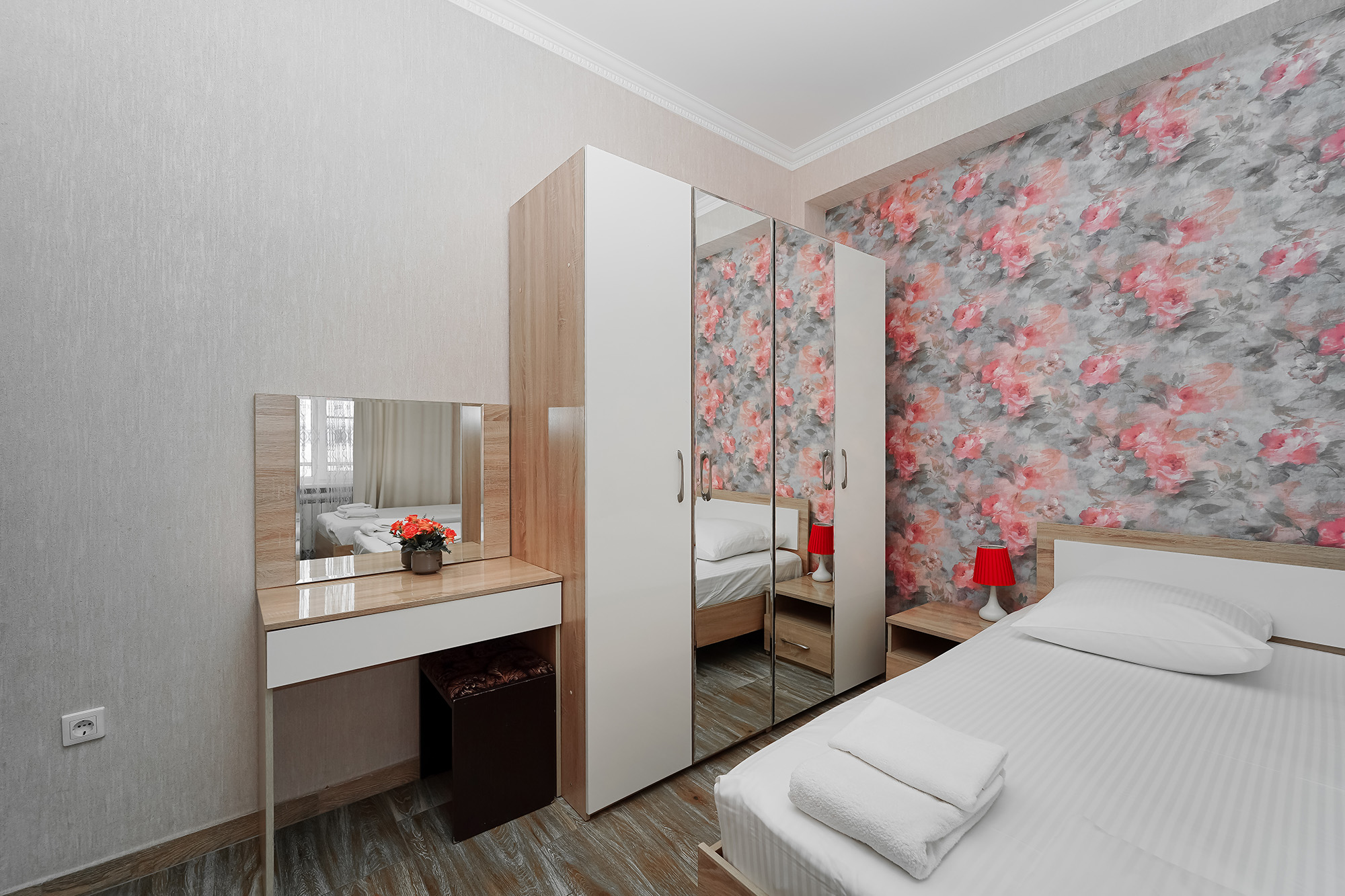 - Мебель: вешалка, зеркало, кровати односпальные, прикроватные тумбочки, стол, стулья, шкаф