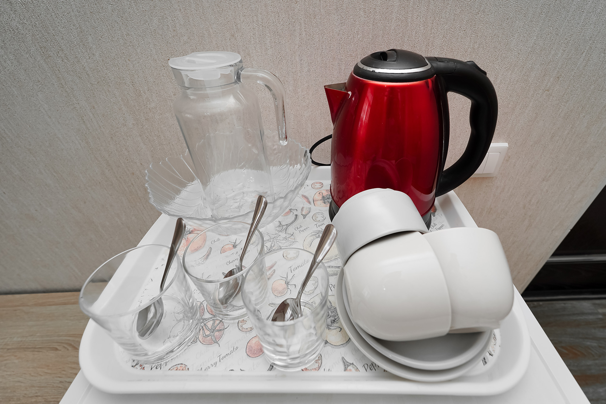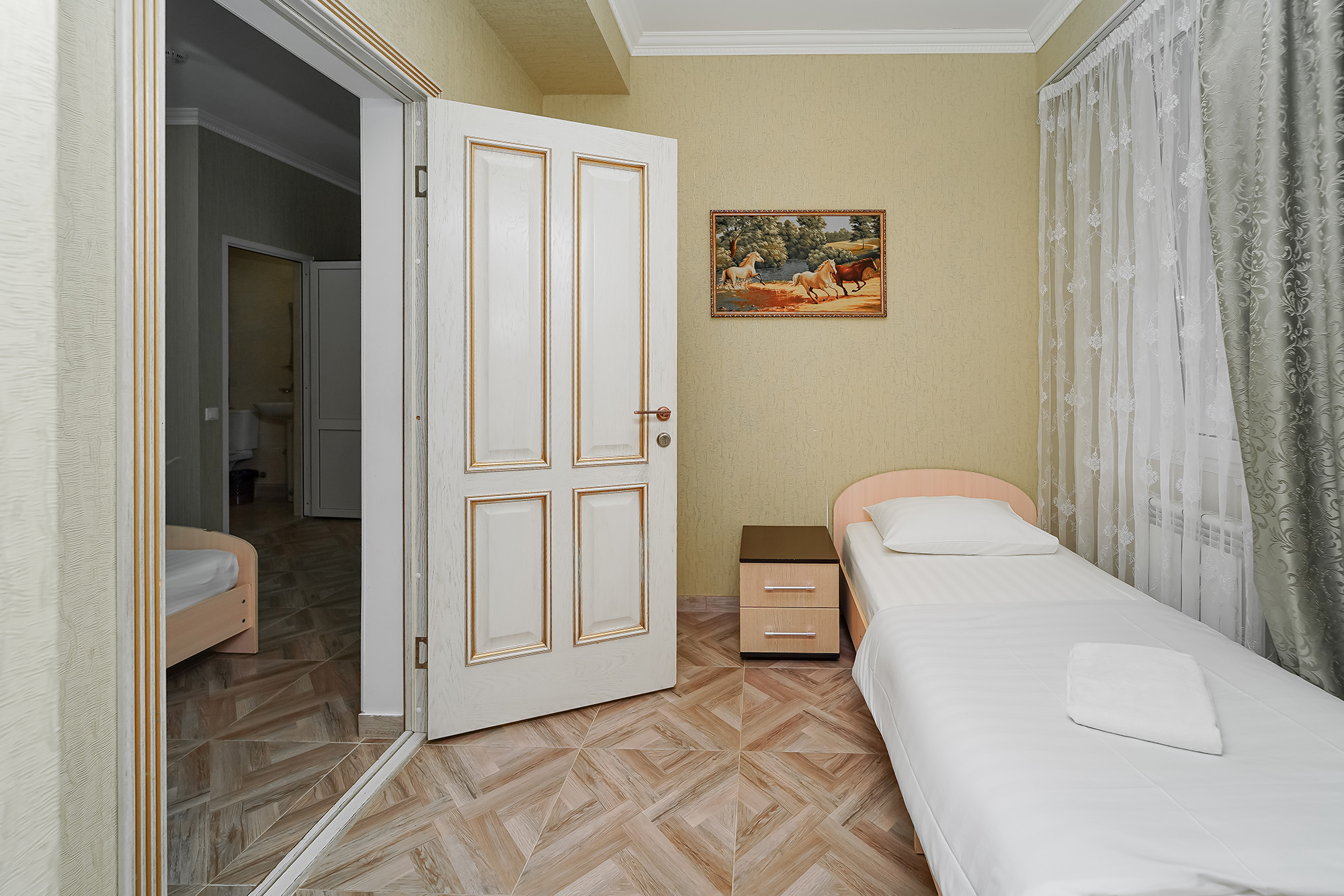 - Мебель: вешалка, зеркало, кровать двуспальная, кровать односпальная, прикроватные тумбочки, стол, стулья, шкаф